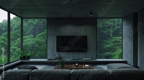 Modern Industrial Living Room with Concrete Walls, Grey Sofa, and Floor-to-Ceiling Windows