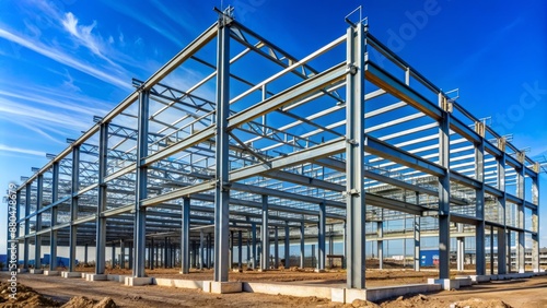 modern, industrial, metal, framework, construction, large, building, beam, column, blue, sky, background, architecture, engineering, steel, structure, design, manufacturing, factory, workshop, machinery, equipment, crane, lifting, rigging, wire, rope, suspension, overhead, height, expanding, growing, complex, intricate, detailed, precision, perfection, geometric, angle, shape, curve, line, form, section, area