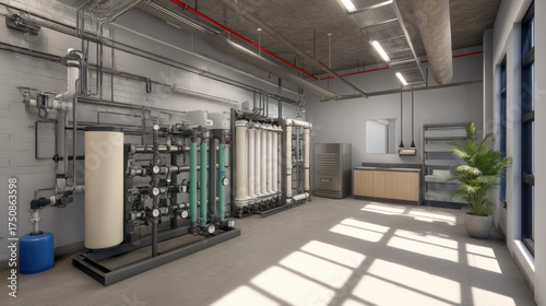 Modern industrial water treatment facility interior with equipment and pipes. a clean, modern industrial facility with advanced water treatment technology.