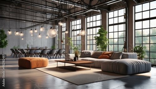 Modern interior design of a spacious room with stylish furniture, large windows, and decorative lighting, on an industrial background, concept of modern living space. 3D Rendering