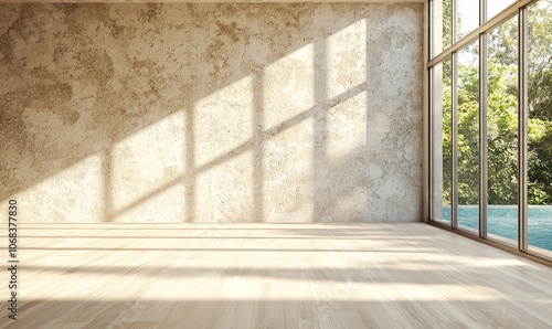 Modern interior of an empty room with large windows and light wood flooring. The walls are made from sandstone cladding, and a light blue pool is visible outside the window