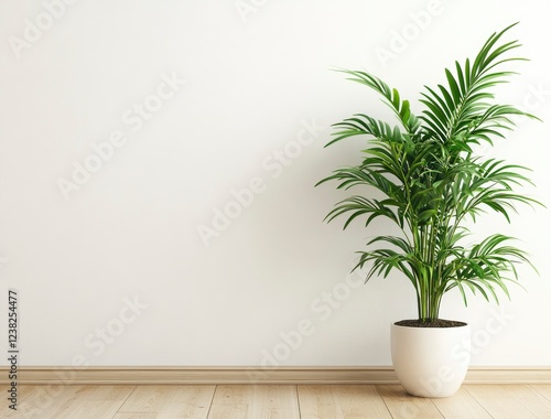 Modern interior, white wall with wooden floor and cabinet on the right side, plant pot near clock on the wall, mock-up with copy space for design