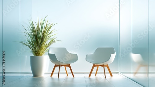 Modern interior with white chairs and green plant