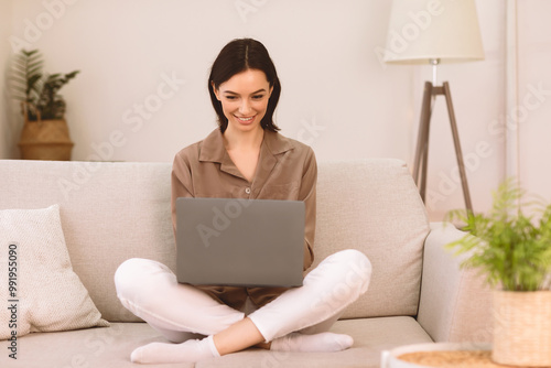 Modern Job Lifestyle. Young woman sitting on sofa at home working on laptop online, using internet, copy space