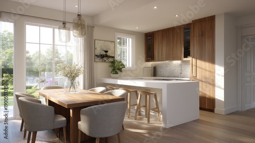 kitchen, dining room, interior, design, table, chair, window, natural light, modern, home, room, furniture, wooden, white, contemporary, living, house, architecture, light, space, luxury, view, lifestyle, apartment, decor, elegant, clean, sunny, day, indoor, empty, residential, wood, cabinetry, minimalist, bright, domestic, comfortable, stylish