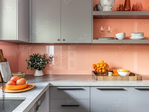 kitchen, modern, grey, cabinet, peach, backsplash, countertop, granite, sink, faucet, dishwasher, shelf, plate, bowl, goggles, wine, orange, fruit, lime, plant, greenery, wooden, tray, decor, style, design, home, interior, elegant, stylish, minimal, clean, simple, aesthetic, contemporary, bright, light, calm, peaceful, organised