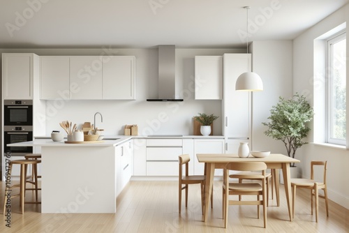 kitchen, dining, modern, white, wooden, table, light, natural, calm, vibe, elegant, design, cosy, room, floor, chair, window, plant, appliance, counter, sink, faucet, cabinet, hood, stove, ceiling, flooring, airy, clean, bright, happy, relaxing, peaceful, roomy, neutral, minimalist, beautiful, harmony, simple, comfortable, sophisticated, inspiration, creativity, serene, inviting, sleek, smooth, refined