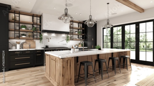 kitchen, island, cabinetry, window, lighting, decor, wood, design, modern, appliance, shelf, plant, seating, dining, space, layout, style, interior, home, furniture, counter, utensil, cook, epicure, cooking, elegance, minimalism, comfort, functionality, atmosphere, arrangement, open, bright, cosy, chic, contemporary, aesthetic, storage, accessory, warmth, texture, finish, contrast, ambience, environment, family, gathering
