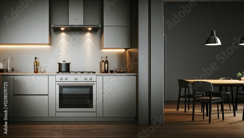 Modern kitchen interior with dark cabinets and dining area in the background.