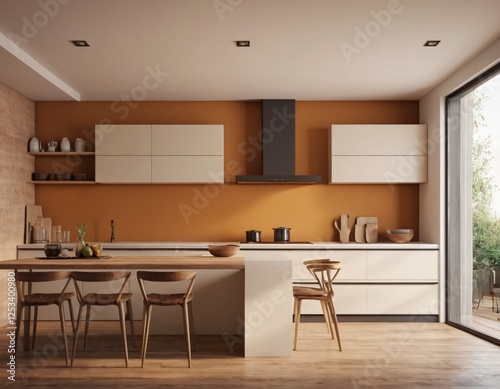Modern Kitchen interior with empty blank wall for mockup template display. 3D Rendering