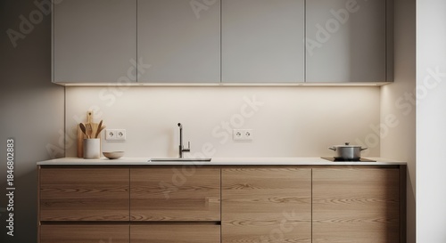 Modern Kitchen Interior with Sleek Cabinetry, Under Cabinet Lighting, and Stainless Steel Fixtures