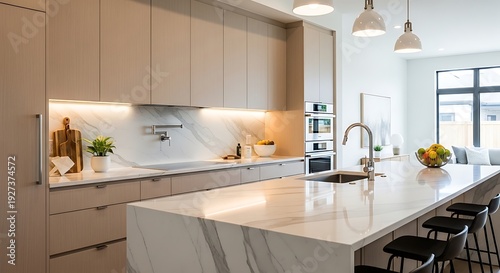 kitchen, marble, island, cabinet, interior, organisation, chair, lighting, sink, simplicity, luxury, furniture, refrigerator, sleek, ambience, microwave, glassware, faucet, contemporary, appliance, elegance, lamp, utensil, bottle, illumination, atmosphere, large, side, brightness, oven, cleanliness, plant, white, modern, minimalist, scene, tableware, dinnerware, flower, pendant, cookware, vase, decor, 1, jar, viewed, backsplash, countertop