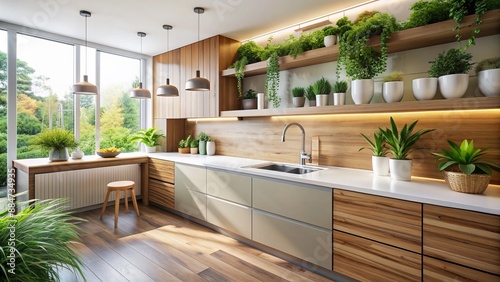 modern, kitchen, interior, sleek, sink, greenery, counter, crisp, white, background, warm, wooden, cabinet, minimalist, clean, line, simplicity, elegance, sophistication, natural, light, soft, shadow, subtile, refined, detail, texture, experiencing, atmosphere, ambience, calming, serene, peaceful, harmony, balance, dimensioning, aesthetic, design, style, ornamentation, utility, functionality, efficiency, technology, appliance, hard-wearing, sustainable