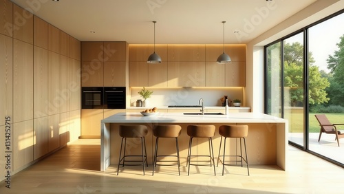 Modern kitchen island with light wood cabinetry and integrated appliances, bathed in sunlight streaming through expansive glass doors