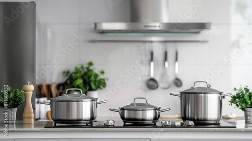setup, stainless, pot, ceramic, hob, modern, kitchen, steel, design, food, house, background, home, space, wall, interior, room, cooking, metal, glasses, furniture, flat, healthy, advertising, apartment