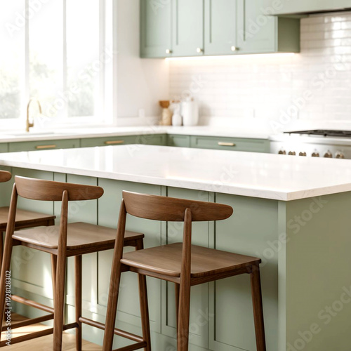kitchen, modern, green, cabinet, white, marble, island, interior, design, home, decor, dining, lifestyle, culinary, cooking, residential, architecture, furniture, wood, stool, countertop, appliance, sink, window, natural, light, clean, minimalistic, aesthetic, chic, trendy, house, room, indoor, comfortable, elegance, sophisticated, domestic, scene