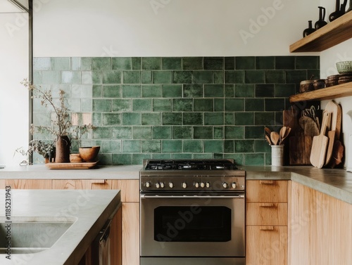 kitchen, modern, green, tile, backsplash, wood, cabinet, stove, oven, countertop, concrete, shelf, utensil, wooden, spoon, cutting, board, pottery, vase, dried, flower, minimalist, design, style, home, decor, interior, cooking, appliance, range, farmhouse, rustic, chic, clean, simple, elegant, light, neutral, grey, brown