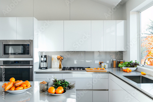 Modern kitchen with sleek appliances cooking ingredients