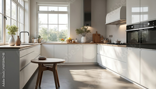 kitchen, modern, design, interior, cabinetry, appliance, sleek, white, minimalist, clean, bright, natural light, contemporary, home, decor, furniture, layout, storage, organisation, comfort, functionality, lighting, elegance, arrangement, surface, wood, plant, colours, room, wall, sink, stove, oven, hood, dining, area, table, seating, atmosphere, warmth, efficiency, homelike, ambience, innovation, residential