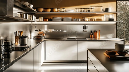 kitchen, modern, stainless, steel, appliance, open, shelving, cabinet, countertop, sink, faucet, window, light, shadow, wood, shelf, dish, bowl, pot, pan, utensil, knife, jar, glasses, bottle, storage, organisation, clean, minimalist, contemporary, design, home, interior, decor, room, space, bright, natural