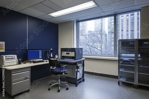 laboratory, office, science, research, technology, equipment, computer, desk, chair, window, city, view, building, modern, room, interior, workspace, analysis, experiment, datum, machine, screen, monitor, table, floor, wall, light, design, clean, professional, medicals, industrial, innovation, development, instrument, system, device, apparatus, tool, hardware, software, digital