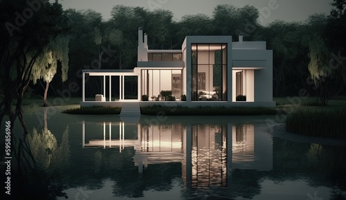 Modern lakeside house with amazing water mirror, where it is an experience to live. Generative AI Technology