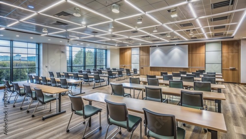 classroom, modern, empty, chair, table, projection, screen, corporate, training, education, conference, event, meeting, space, auditorium, hall, seminar, discussion, presentation, multimedia, technology, business, interior, design, architecture, lecture, room, auditor, dais, seating, row, column, white, wall, floor, window, door, glasses, pane, beige, carpet, shades, lighting, ceiling, tile, acoustic, background