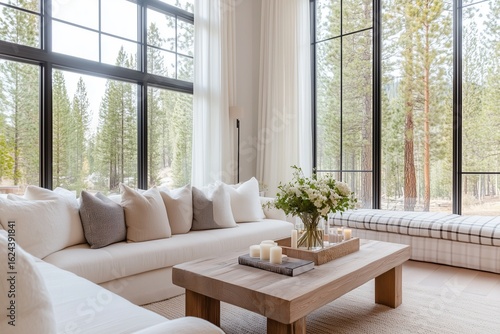 Modern living room featuring a cozy white sofa adorned with plush pillows, a wooden coffee table with candles, and large windows showcasing a serene forest view