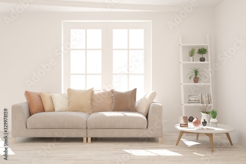 Modern living room in white color with sofa. Scandinavian interior design. 3D illustration