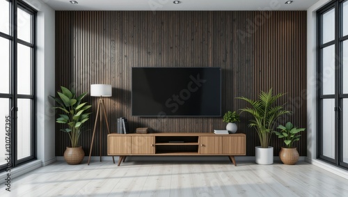 living, room, interior, design, modern, furniture, television, wall, wood, decor, plant, lighting, home, apartment, house, contemporary, minimalist, cosy, elegant, roomy, bright, sunlight, window, style, cabinet, natural, warm, comfortable, aesthetic, homeowner, family, relaxation, space, arrangement