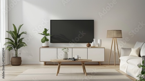 living, room, interior, design, modern, minimal, contemporary, decor, furniture, couch, sofa, television, screen, cabinet, table, hot drink, plant, potted, floor, lamp, rug, white, cream, beige, wooden, natural, light, sunlight, home, house, style, elegant, comfortable, cosy, stylish, roomy, bright, airy, minimalist, simple, clean, space