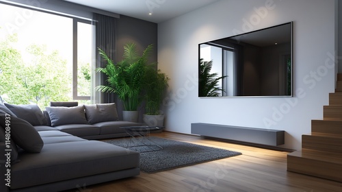 living, room, interior, design, modern, sofa, grey, television, large, screen, wooden, stair, sectional, contemporary, home, decor, furniture, house, apartment, style, elegant, minimalist, comfort, relaxation, plant, carpet, floor, lighting, window, view, cosy, stylish, clean, simple, bright, dark, grey, wood, architecture, space, ambience, aesthetic