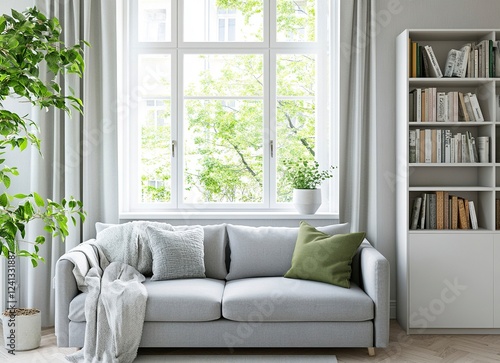 Modern living room interior with a grey sofa and white bookcase near a window. Scandinavian home design in light gray color, with green accents, in a minimalistic style, with empty space for text.