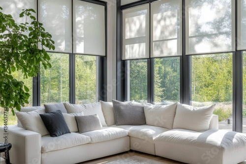 Modern living room interior with a white sofa and a large window with roller blinds, mock-up