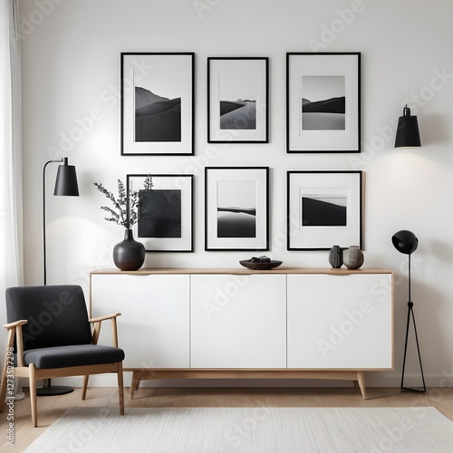 modern, living room, interior, home decor, black-and-white, picture, frame, sideboard, cabinet, wooden, minimalist, contemporary, stylish, elegant, scandinavian, cosy, comfortable, armchair, wooden chair, floor lamp, vase, dried flowers, plant