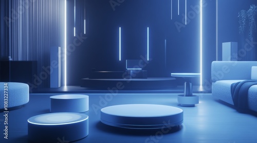 interior, modern, living, room, design, furniture, blue, neon, light, futuristic, minimalist, contemporary, stylish, elegant, home, decor, house, couch, sofa, table, chair, lamp, wall, floor, ceiling, window, curtain, white, grey, dark, abstract, clean, simple, space, style, comfort, luxury, bright, soft, ambient, art, cosy, night, architecture, minimal, glow