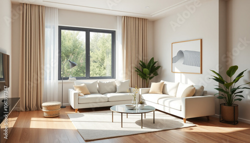 Modern living room interior with fireplace, featuring contemporary furniture and stylish decor