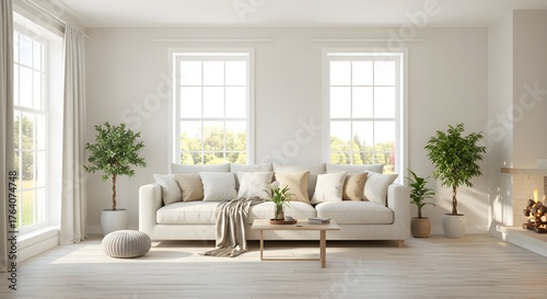 Modern living room interior with sofa windows plants and sunlight
