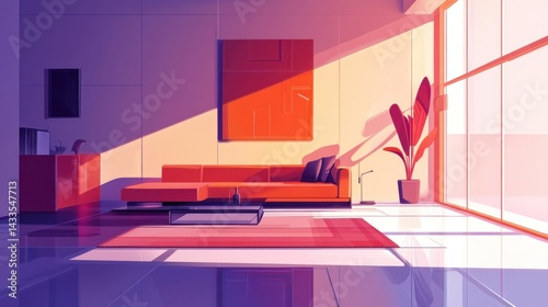 room, interior, modern, living, furniture, sofa, couch, design, home, contemporary, style, artwork, plant, light, shadow, window, glasses, floor, carpet, rug, square, pattern, geometric, orange, red, purple, violet, cushion, pillow, wall, bright, empty, minimalist, abstract, clean, decor, simple, space, table, box, cabinet, office, illustration, aesthetic, sunny, day, composition