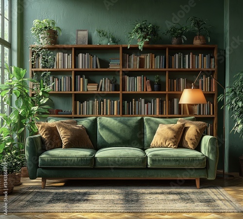 Modern Living Room Mock Up with Minimalistic Design and Green Velvet Sofa in Scandinavian Style