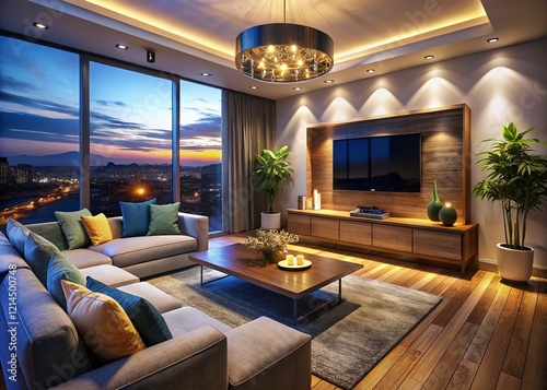 Modern Living Room Night Photography: Cozy TV Area with Ambient Lighting