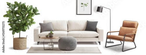 Modern living room setup featuring stylish furniture and decor elements with natural touches in a bright, minimalist space