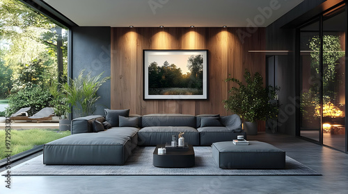 Modern living room with a cozy sofa, artwork, and large windows overlooking greenery.