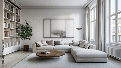 living, room, interior, design, modern, cosy, sofa, bookshelf, art, decor, furniture, minimalist, neutral, home, contemporary, roomy, light, bright, comfortable, elegant, clean, warm, wooden, hot drink, table, plant, window, calm, stylish, apartment, space, relaxing