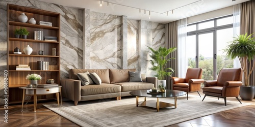 Modern Living Room with Brown Leather Sofa, Marble Wall, and Bookshelf, Interior Design, Home Decor, Furniture ,interior design