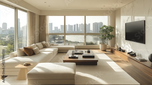 modern, living, room, city, view, interior, design, luxury, apartment, roomy, furniture, beige, minimalist, contemporary, home, decor, architecture, sofa, hot drink, table, television, daylight, balcony, window, natural, light, calm, elegant, cosy, stylish, comfortable, decorated, area, room, luxurious