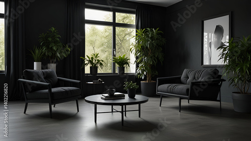 Modern Living Room with Dark Walls Green Armchairs and Sofa Black Coffee Table Large Green Plants Floor Lamp and Natural Light