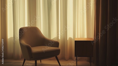 Modern living room with elegant armchair and wooden side table, embodying minimalist comfort and timeless design.