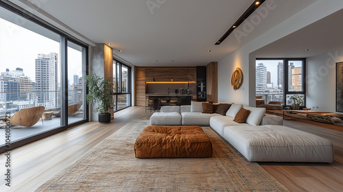Modern living room with fireplace, featuring luxury furniture and stylish decor, with wood flooring, a sofa, carpet, and large windows