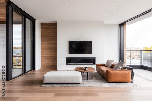 Modern living room with large windows and comfortable furniture design in a contemporary home